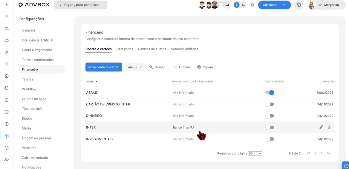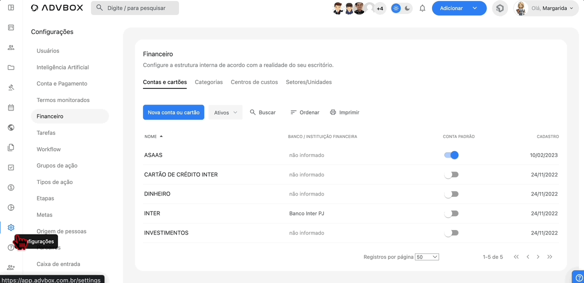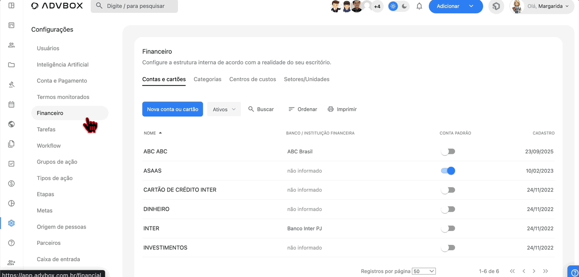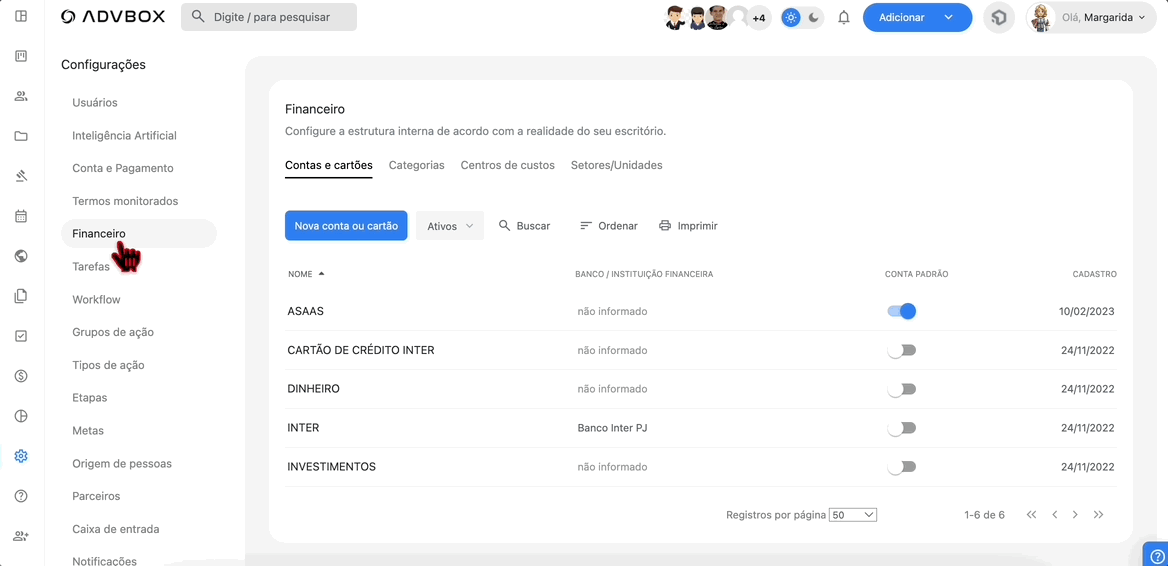 Neste artigo, você vai aprender como configurar todas as opções do módulo financeiro da ADVBOX, incluindo contas e cartões, categorias, centros de custo e setores/unidades para organizar suas receitas e despesas.