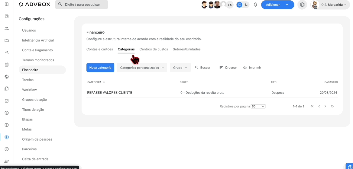 Importante: Categorias Personalizadas são categorias que foram adicionadas, seja pelo escritório ou através da migração dos dados financeiros.