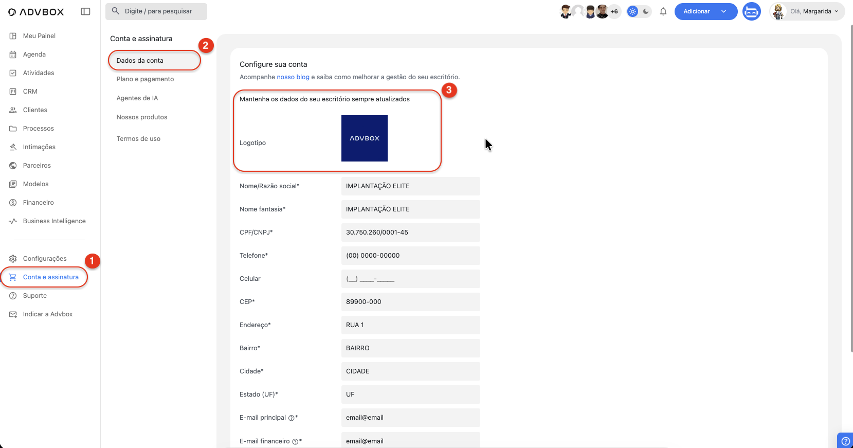 Dica: Manter os dados da conta sempre atualizados é fundamental para garantir o funcionamento correto de todas as funcionalidades da ADVBOX e receber comunicações importantes sobre sua conta.
