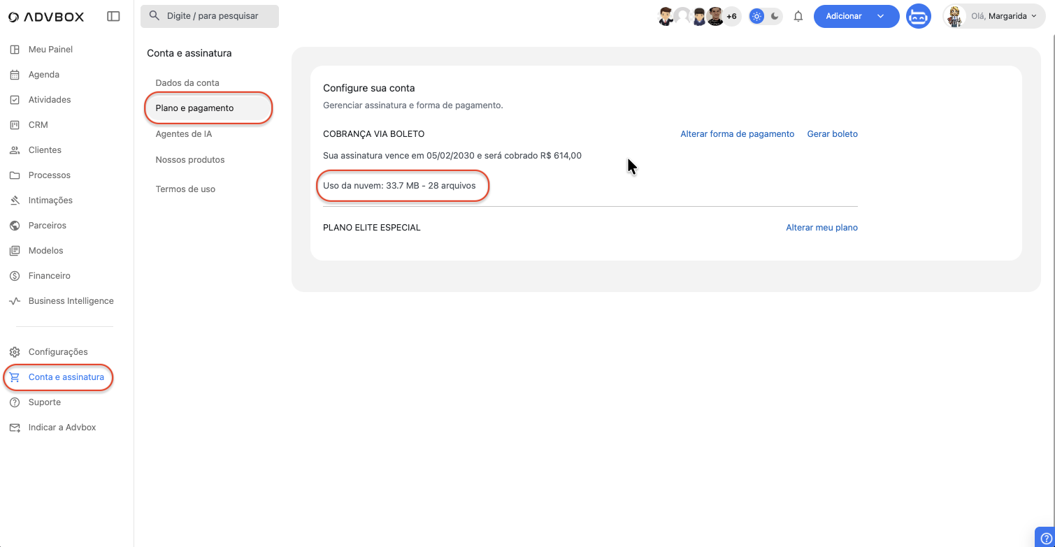 Na ADVBOX, o Uso da nuvem mostra quanto espaço de armazenamento e quantos arquivos já foram utilizados na plataforma. Essa informação está disponível no Menu Conta e assinatura, logo abaixo dos dados da assinatura.