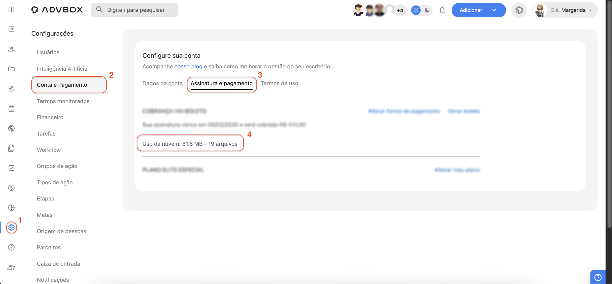 Na ADVBOX, o Uso da nuvem mostra quanto espaço de armazenamento e quantos arquivos já foram utilizados na plataforma. Essa informação está disponível no Menu Configurações, submenu Conta e pagamento, na categoria Assinatura e pagamento, logo abaixo dos dados da assinatura.