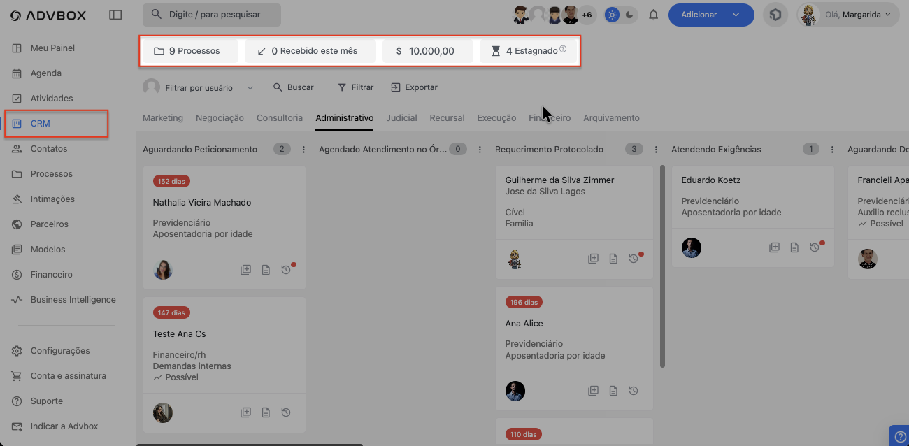 Na parte superior do seu quadro Kanban no CRM, sempre que você clica em uma fase, aparecem 4 contadores importantes. Eles servem para te dar, de forma rápida e visual, um resumo da quantidade de processos e do andamento daquela fase.