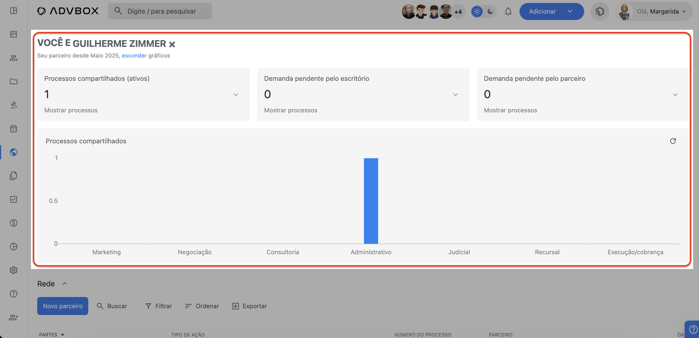 O Menu Parceiros não serve apenas para visualizar processos compartilhados, ele também oferece gráficos e métricas que ajudam a acompanhar e gerenciar sua colaboração com outros escritórios.