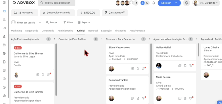 - No Menu CRM, localize o card do processo, clique, segure e arraste o card para a nova fase ou etapa