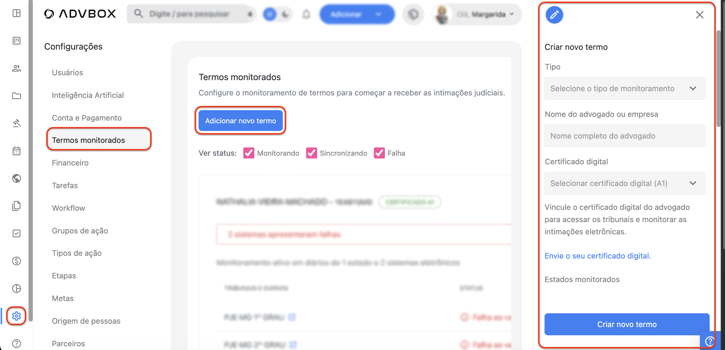 No menu lateral Configurações > Termos monitorados e clique no botão + Adicionar novo termo.
