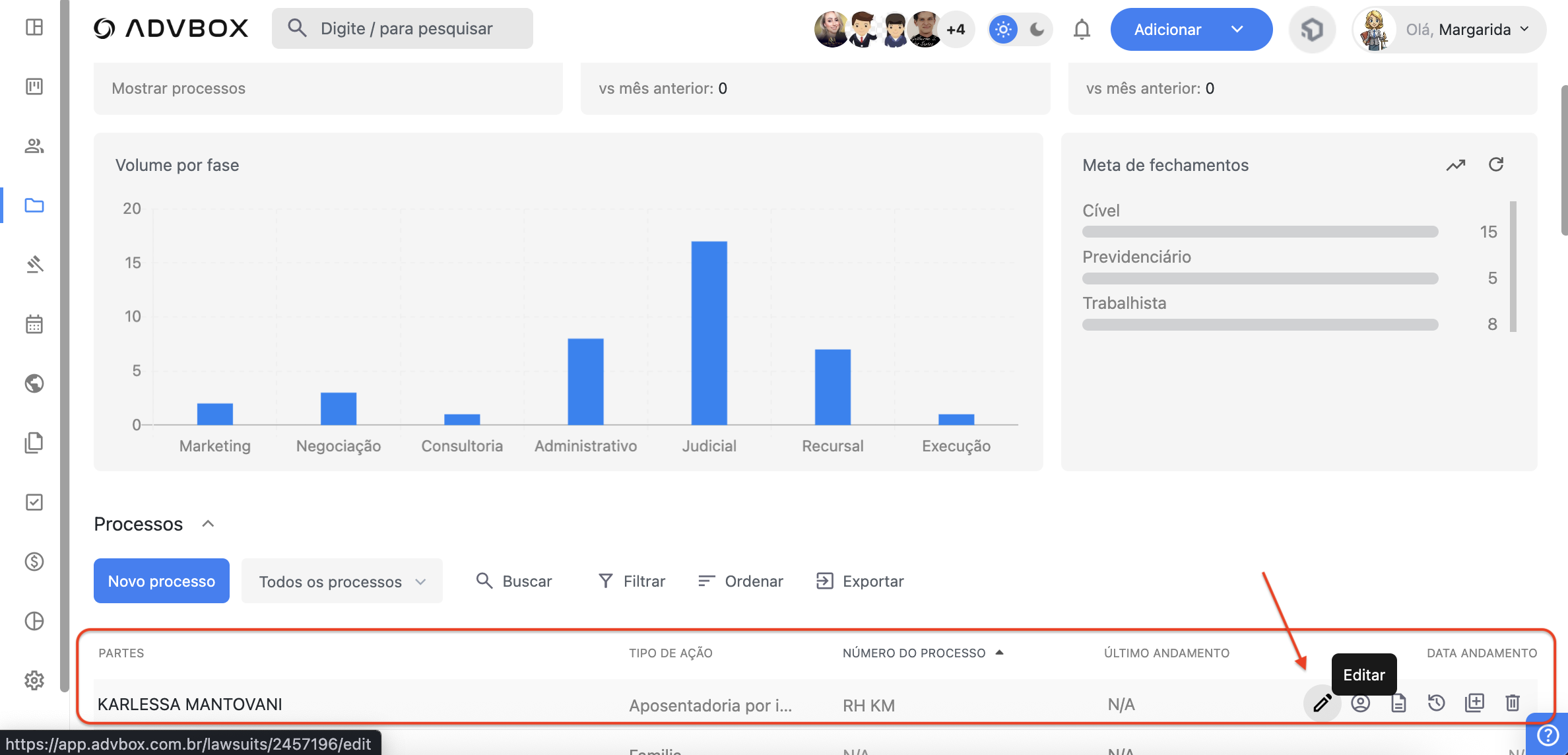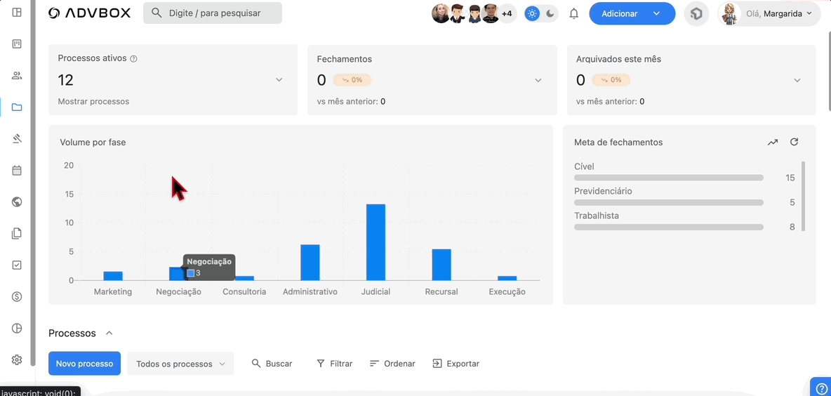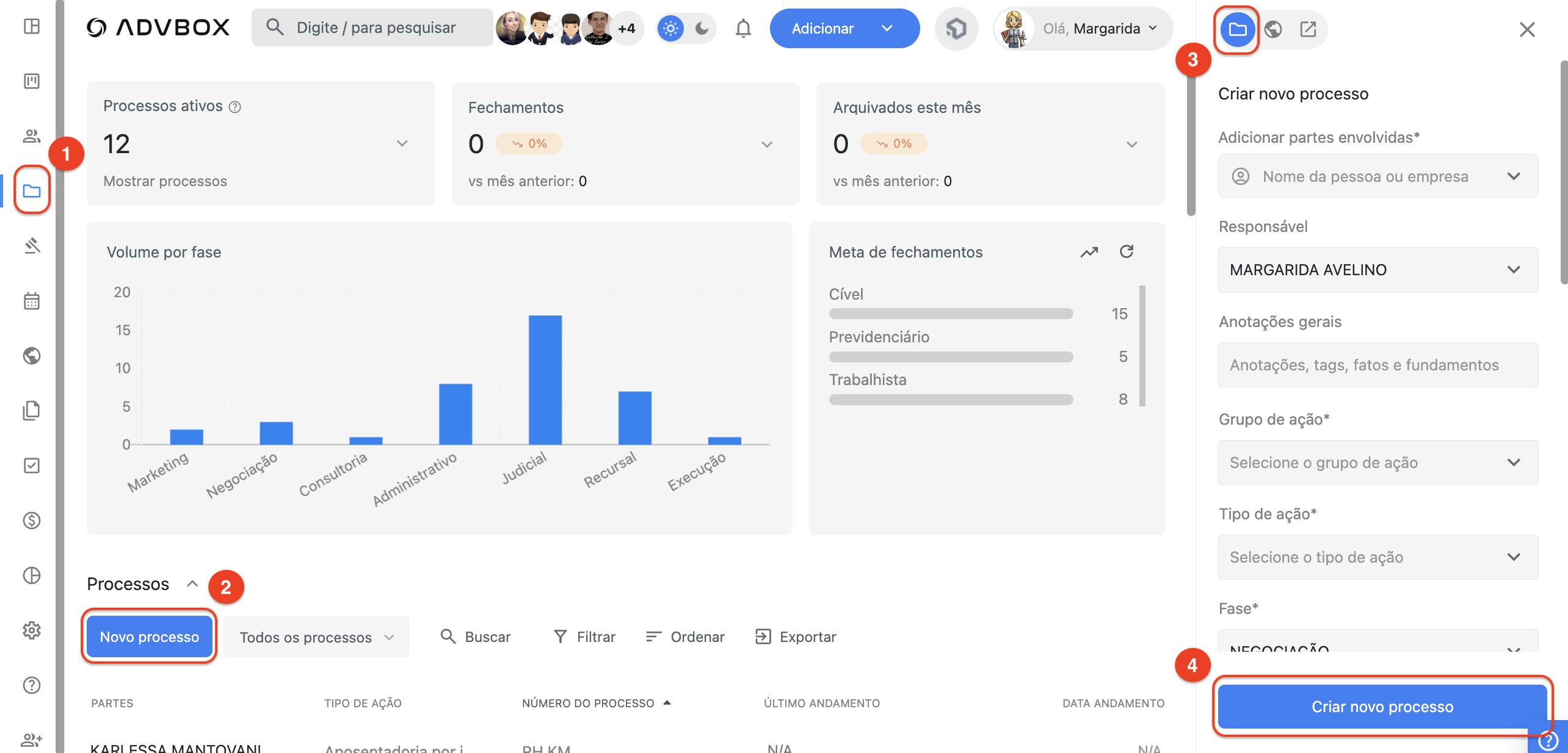 Importante: Definir corretamente quem é o responsável garante filtrar e pesquisar todos os processos vinculados àquele advogado diretamente no sistema, facilita o controle operacional e ajuda a identificar rapidamente quais processos pertencem a cada colaborador. A escolha do responsável não interfere automaticamente na atribuição de tarefas nem na geração de relatórios de produtividade.