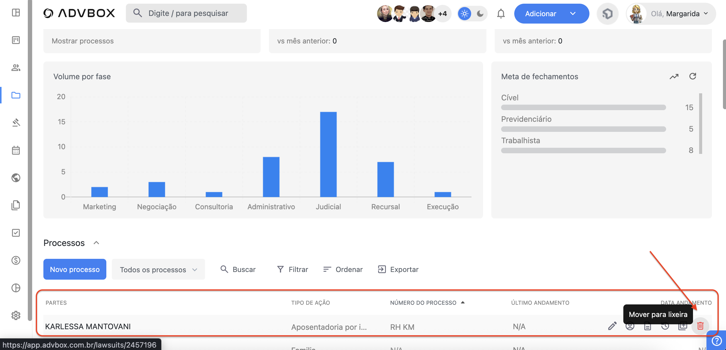 Importante: O processo não é apagado definitivamente. Ele é movido para uma listagem separada chamada "Somente excluídos".