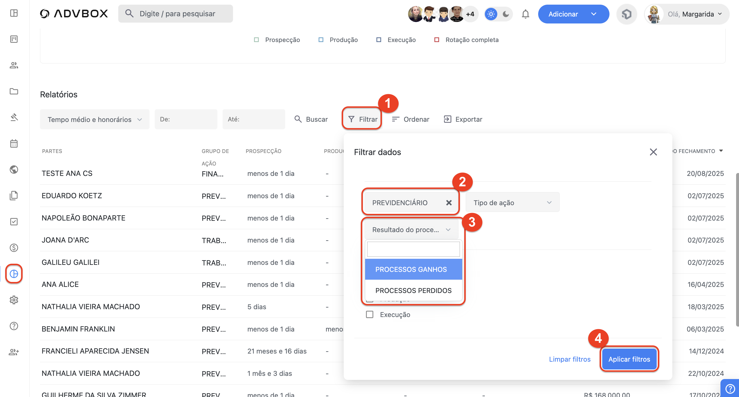 No campo Resultado do Processo, escolha Processos Ganhos ou Processos Perdidos (conforme sua necessidade).