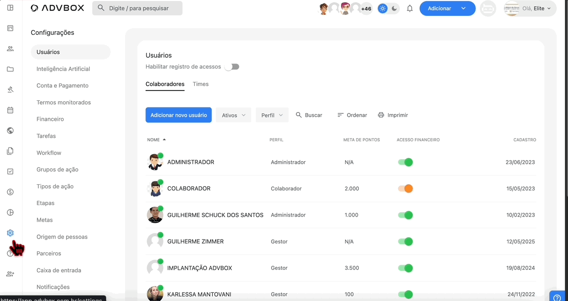Acesse o Menu Configurações na ADVBOX > Usuários.